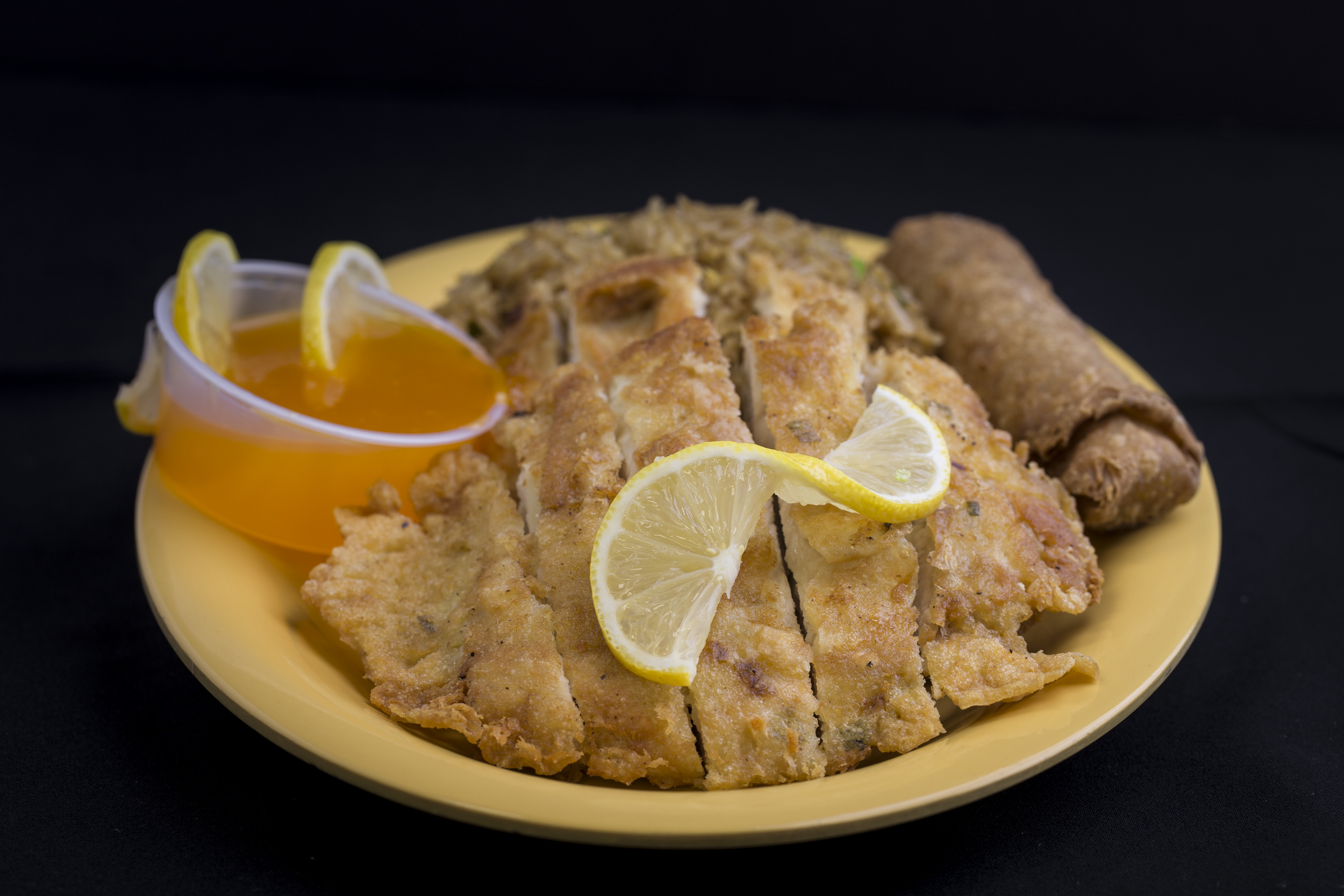This specialty plate is made with a ginger marinated chicken breast and lemon sauce. Served with fried rice, egg roll or 2 stuffed crab rangoon, soup and drink.